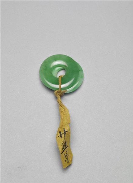 翠玉耳環,玉質瑩亮,綠白相間。其外型皆如玉璧,壁面略微弧凸,一式兩件。
