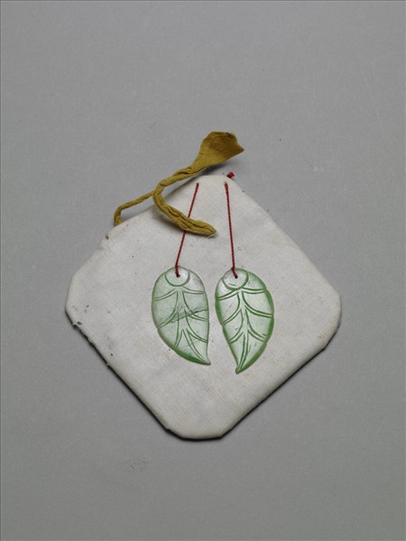 翠玉質片狀飾件,一式兩件,琢成葉片造型,並以雙陰線刻劃出葉脈。頂端穿有孔洞,各繫以一紅線。