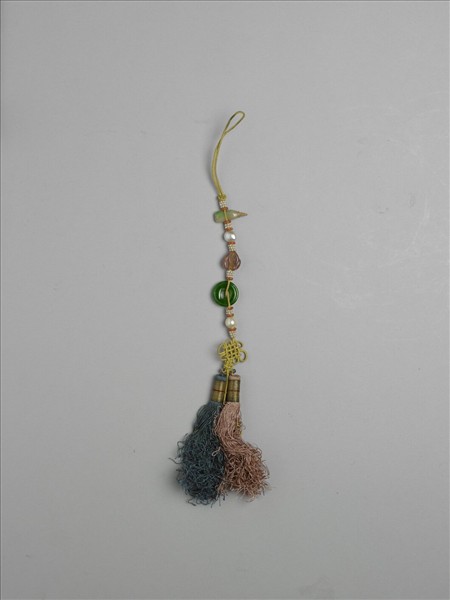 墜飾,以黃色絲繩穿繫飾件而成。飾件包括有翠玉、珍珠、碧璽等,飾件與飾件間,以珊瑚米珠與米珠結子相隔。墜飾末端打一盤長狀結子,下接粉紅與深藍二色絲穗。