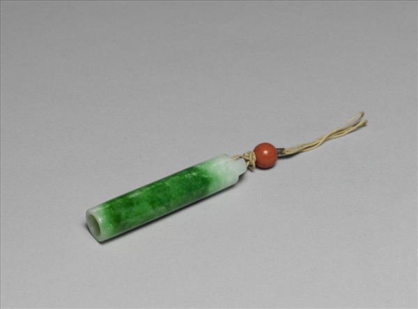 柱狀翎管,上小下大,首有一環,上拴珊瑚珠一。此件翎管改製為佩飾使用。