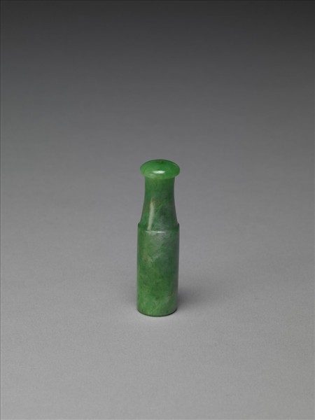 翠玉製為煙嘴,光素無紋。外型如直筒器身的長頸小瓶,內中空,可容納嵌煙管。