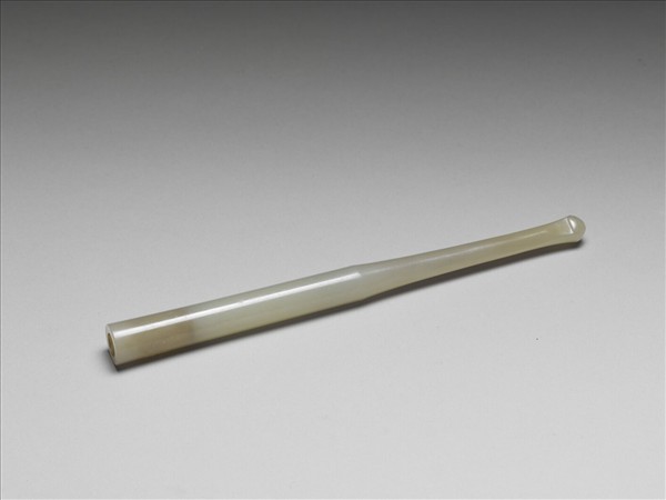玉煙嘴,玉質灰白帶赭斑,全器光素無紋。筒狀器身中空,可容納嵌裝煙管、煙草。