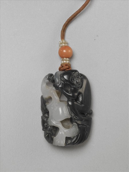 匠人巧妙利用玉色,以鏤空技法雕為黑猴攀摘白桃之貌,深具巧雕之趣。