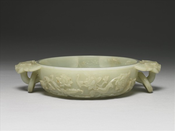玉質,直口,淺壁,雙獸首啣環耳,平底,圈足。以高浮雕技法製作圖紋,底內中心飾一團龍,外壁飾折枝月季花。底陰刻「乾隆年製」雙行四字楷款。附雕花木座一只。