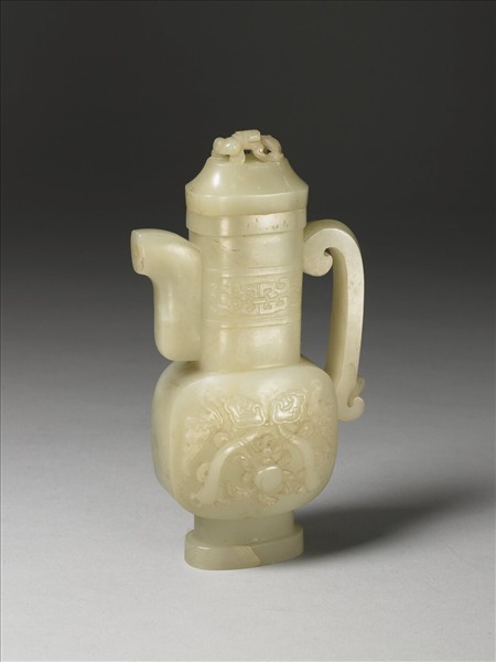 玉質,直口,寬唇,直長頸,方腹,外撇圈足,有流及把,帶盝頂式子母口蓋,螭形鈕。蓋鈕以立雕雕出S形之螭龍立於蓋上,器身以淺浮雕製作圖紋,頸部為拐子龍紋,上下各有一弦紋,器腹雕有一對蝙蝠及如意,中央有一桃實,表「福壽如意」,圈足外以陰線刻製作三角雲雷紋。附木座一只。