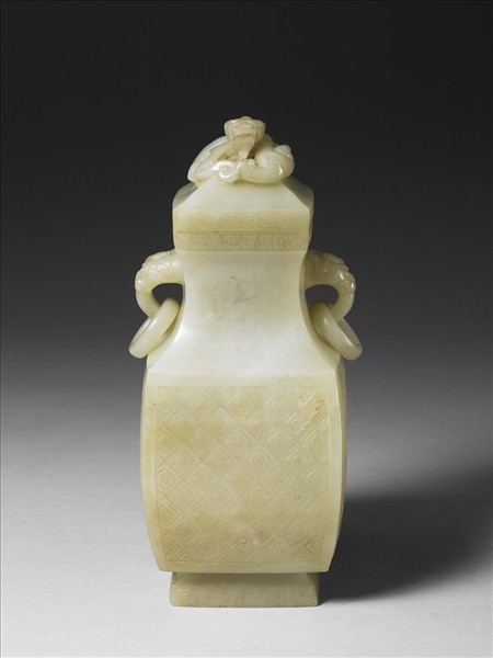 玉質,四方形,敞口,長頸下端外撇,鋪首銜環耳,折肩,鼓腹,方圈足,帶梯形蓋,盤龍鈕。以立雕製作蓋鈕及雙耳,陰線刻製作蓋、口、足緣之回紋邊飾及腹部之菱格紋飾。底部有「大清乾隆仿古」三行六字隸款。