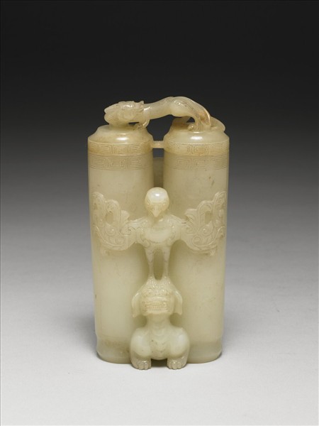 雙聯瓶,圓口,直長腹,近足處有凹入,蓋及口緣有陰線刻回紋邊飾;下方立雕一獅子,狀似背馱二瓶,獅尾上方豎有一柱,頂端有一如意雲形板,陰刻獸首紋,一高浮雕展翅鳳鳥立於獅頭之上,瓶蓋中央有一圓柱相連,蓋上立雕螭虎一隻。附嵌金絲木座一只。