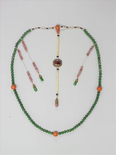 朝珠是清代宮廷君臣於正式場合搭配朝服、吉服時的穿戴配件之一。朝珠的樣式以108顆圓珠串成,其間另有佛頭珠四顆,外加記捻三串、背雲一條,材質除了東珠為皇家專用,珊瑚、青金石、綠松石和琥珀是皇帝祭祀用之外,其他場合可以隨意選擇材質。這件翠玉朝珠的翠玉材質透綠,珠徑較大,搭配珊瑚佛頭更顯鮮亮,記捻和背雲以粉紅碧璽為材,小墜角也是翠玉,翠玉、碧璽和珊瑚三種色調,主次分明,美麗大方。