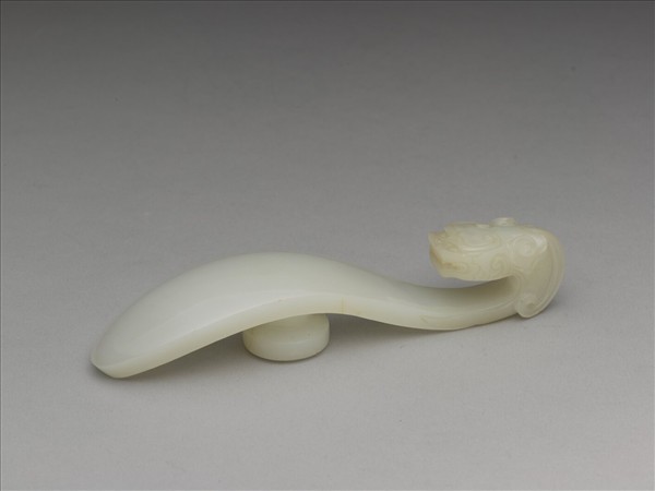 全器中央拱起,一端反折為鉤,雕龍首;拱起處背有一圓鈕,可將帶扣固定於革帶。