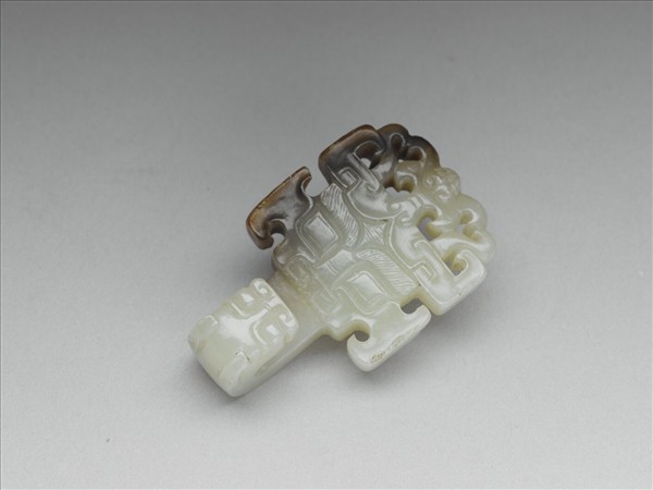 面約呈方形,鏤雕獸面紋,鉤部亦作獸首;背有一圓鈕,淺刻卷渦紋為飾,可將帶扣固定於革帶。
