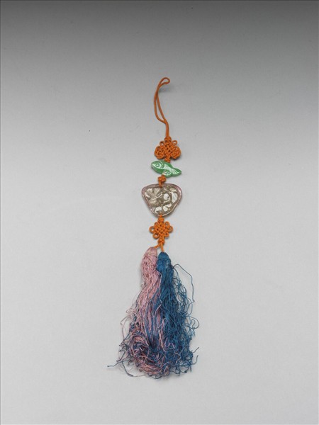 此配墜由上而下分別串翠玉魚一件、粉紅碧璽雕一件。 墜飾以橘紅色縧繩相連,兩端各打一吉祥結,最下方垂粉紅及青藍二色絲穗。