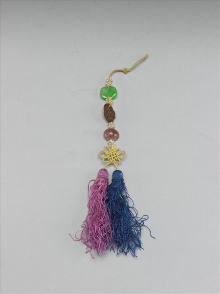 此配墜以一巧雕棗核花籃為中心,上下分別有圓形翠玉及碧璽一件,墜飾間各夾一組緝米珠、共計四小組。墜飾以黃色縧繩相連,下方打一吉祥結,末端垂粉紅及青藍二色絲穗。