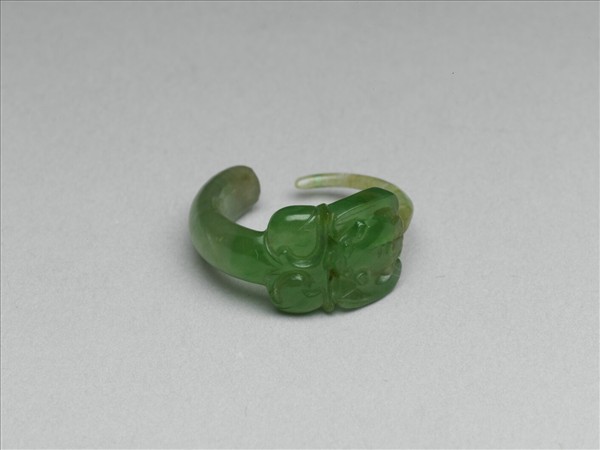 玉質潤澤。器形似玦,為環狀帶缺,缺口一端磨尖作耳針,面淺雕一蝙蝠啣二桃實。與故玉9597為一對,兩只耳環形制相同。