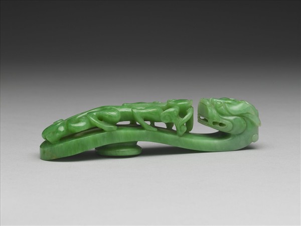 玉質溫潤,色碧綠,鉤部略泛白。全器約呈長條形,中央微微拱起,一端反折為鉤;面鏤雕螭紋,鉤部作螭首、與蟠螭相對;拱起處背有一圓鈕,可將帶扣固定於革帶。