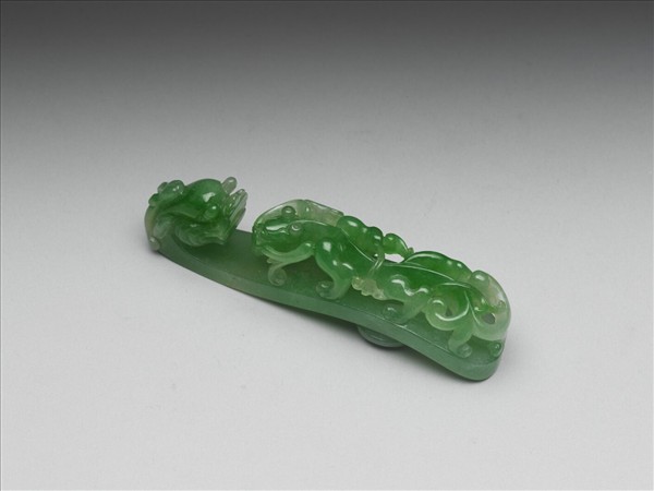 玉帶鉤,玉質瑩潤,通體翠綠。全器約呈長條形,中央微微拱起,一端反折為鉤;面鏤雕螭紋,鉤部作龍首、與蟠螭相對,造型立體;拱起處背有一圓鈕,可將帶鉤固定於革帶。
