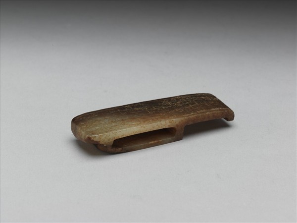 器約呈長方形,面飾乳丁紋,兩側微下折並朝內勾;背光素無紋,雕一方銎,可供穿帶佩繫之用。劍璏爲古代裝飾於寶劍上的配件之一,常嵌於劍鞘中央,以革帶穿過背面方銎、將劍身固定於使用者腰際。劍以玉為飾應爲古代貴族或將軍所有,是當時權力地位的象徵和體現。