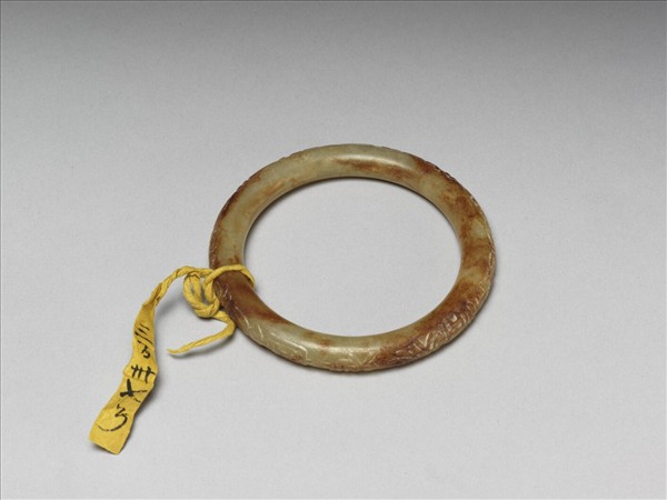 玉鐲,外側浮雕一圈篆字「黃龍天年大吉羊(祥)樂未央益壽年宜文章」。附錦袋,與故玉9620共置於此錦袋中。