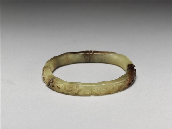 玉竹節式鐲,外側浮雕竹枝與靈芝。附錦袋,與故玉9622共置於此錦袋中。
