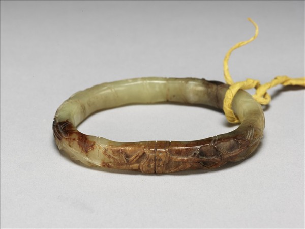 玉竹節式鐲,外側浮雕竹枝與靈芝。與故玉9621共置於錦袋中。