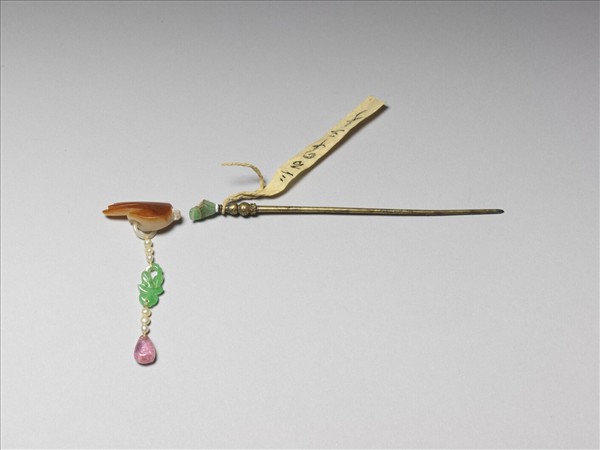 步搖,素圓挺,末端尖。與簪首連接處有葫蘆形裝飾,簪首為手形,拇指與食指彎曲成圈,餘三指平伸,指圈懸有一由玉環、珍珠、翠玉花籃及碧璽墜角串成的串飾。