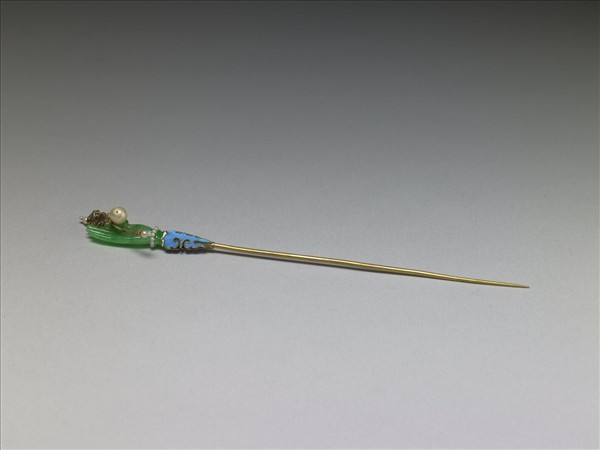 髮簪,素圓挺,末端尖。與簪首連接處有點翠雲紋裝飾,簪首為手形,拇指內彎,食指下彎包住拇指,餘三指伸平,手腕處有一珍珠環,手中有一鍍金絲與珍珠做成的法杖。