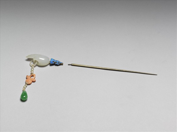 步搖,素圓挺,末端尖。與簪首連接處有點翠雲紋裝飾,簪首為手形,拇指與食指彎曲成圈,餘三指伸平,指圈懸有一由玉環、珍珠、珊瑚花籃及翠玉墜角串成的串飾。