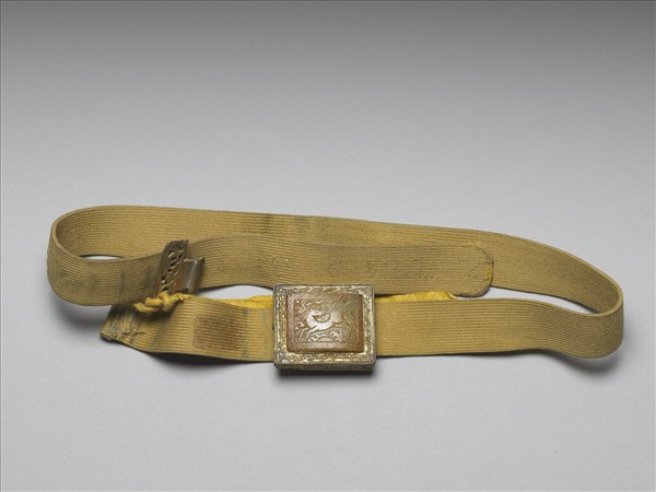 方形帶扣,鏤空纍絲金座,座面滿佈卷葉紋,背為鏤空花卉與葉紋;座內鑲褐沁白玉,玉上雕一馬負八卦,為「河圖」之圖像。外圈刻回紋一周。此扣附繫帶,一鉤套於繫帶尾部,鏤空雕花。