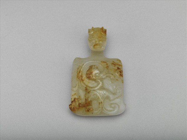 淺浮雕螭紋,鉤作龍首式;背琢圓柱,其上雕雲紋。