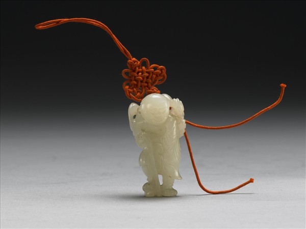玉人,雙手搭一杖,頭套如意形頭箍,身著寬鬆僧服,器身以紅縧穿繫,飾盤長結一與鈕釦結二。