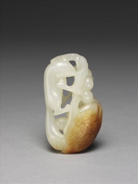 玉質,略呈橢圓,以鏤空技法雕成葡萄一串與藤,一松鼠攀附於藤上,底側一葉片,以陰線刻劃葉脈,沁褐塊。