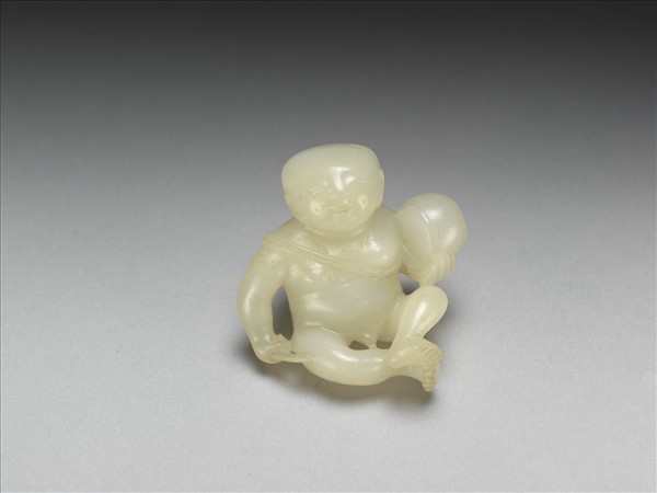 坐地童子,玉質雕成,身無著衣,側背一鼓,左手持鼓,右手持鼓棒。