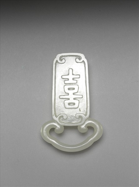 玉帶飾,板上淺浮雕喜字。此器與故玉9673為一對。