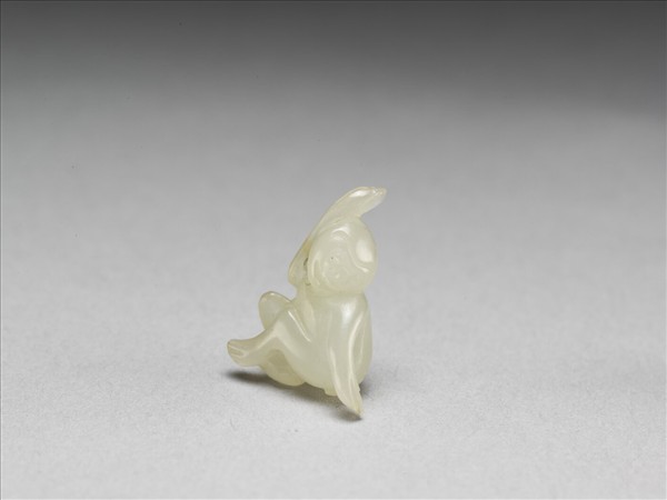 玉猴,採坐姿,側轉俯視,咧嘴如笑,手腳細長,充滿動態與喜感。