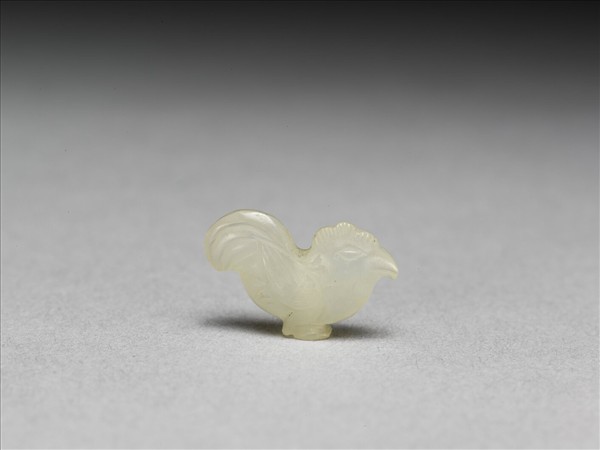 玉公雞,頭大,身扁。背部有通心穿,可供穿繫或固定為其他物品的小配件。
