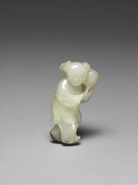 玉人,頭有雙髻。左肩扶捧繡球,顯現歡樂神情。