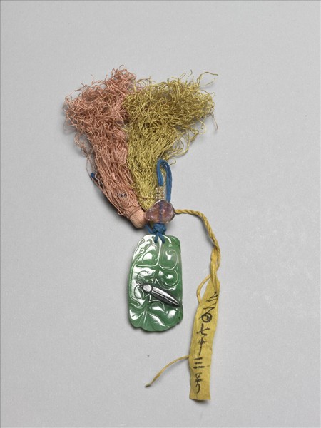 翠玉佩,略成長方形片狀,外壁淺浮雕草葉枝藤,並巧妙運用玉中的黑斑,雕為昆蟲。玉佩上以絲繩穿繫碧璽與紅、黃二色絲穗。