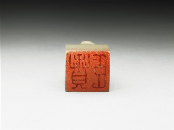 玉章,印面正方,色白,有金黃色斑。印面陰刻二字篆文:「臣賁」。印鈕則雕飾一回首異獸。乾隆皇帝嘗收聚八十方古印,命之為「虹文薈古」,並同儲於一盒四屜,此印即為其中一方。