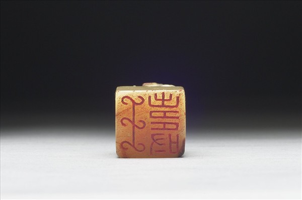玉章,印面正方,色白有赭斑 。印面陰刻二字篆文:「王壽」。印鈕則雕飾一昂首辟邪,辟邪之首尾均有片狀赭斑。乾隆皇帝嘗收聚八十方古印,命之為「虹文薈古」,並同儲於一盒四屜,此印即為其中一方。