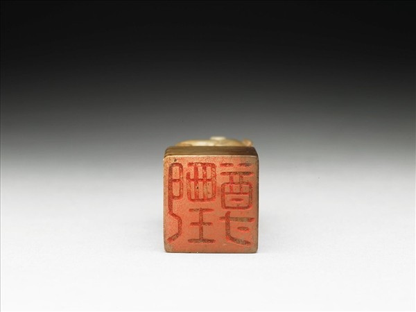 玉章,印面正方,色白有赭斑。印面陰刻二字篆文:「甄尊」。印鈕則雕飾一站立回首異獸,獸身尾部鑿有一孔。乾隆皇帝嘗收聚八十方古印,命之為「虹文薈古」,並同儲於一盒四屜,此印即為其中一方。
