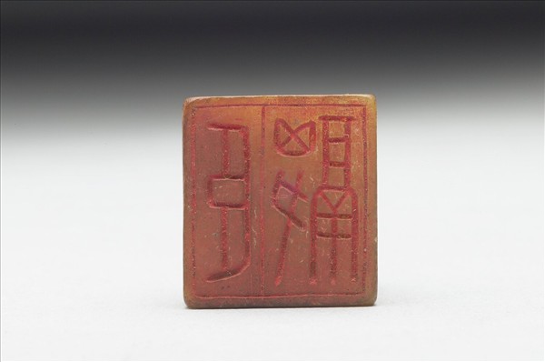 玉章,印面正方,淺褐色。印面起邊欄並陰刻「臣融」篆文二字,中有直欄一道。帶壇鈕,全印光素無紋。乾隆皇帝嘗收聚八十方古印,命之為「虹文薈古」,並同儲於一盒四屜,此印即為其中一方。