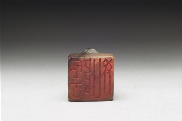 玉章,印面正方,色灰帶黑斑。印面陰刻二字篆文:「陰如」。印鈕則雕飾伏坐昂首的異獸。乾隆皇帝嘗收聚八十方古印,命之為「虹文薈古」,並同儲於一盒四屜,此印即為其中一方。