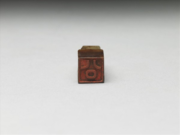 玉章,印面正方,色白有大片赭斑。印面陽刻篆文:「公」字。印鈕則雕如方瓶之形。乾隆皇帝嘗收聚八十方古印,命之為「虹文薈古」,並同儲於一盒四屜,此印即為其中一方。