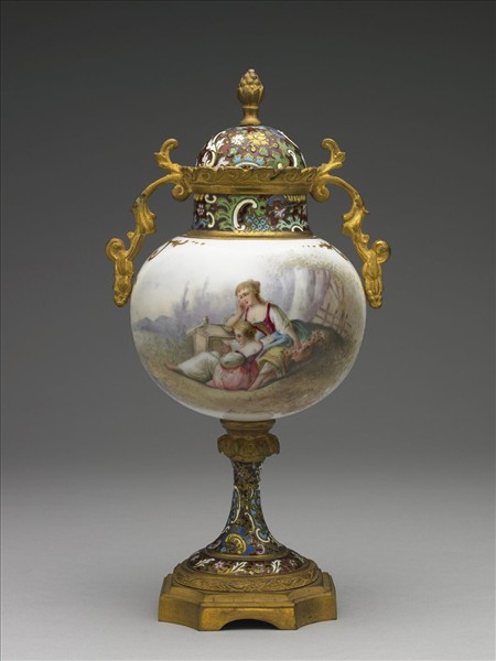 高足罐形器,以球形瓷罐上下嵌裝金屬蓋與足組成,雙葉耳束腰式頸,帶花蕾鈕圓頂蓋,高圈足式基座。金屬器身飾多樣掐絲花葉與幾何紋,瓷罐身繪西洋人物,暈染筆觸係水彩畫效果。本件與故琺1一式成對。