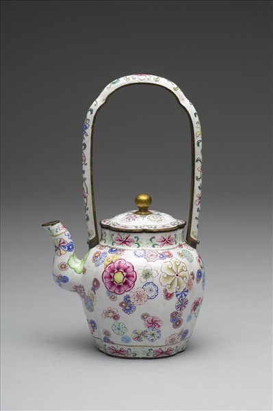 銅胎畫琺瑯。器腹、蓋與底作六瓣式,直頸,碩腹,平底,彎流,帶球鈕蓋,並裝高提梁。器表以白釉為地,提梁、口緣與圈足側圍纏枝番蓮一道,腹繪飾各式皮球式團花,用彩多樣,展現活潑熱鬧的裝飾風格。器底白地藍書「乾隆年製」,加雙圓框,本件一式成對(與故琺4),共儲於有題款「乾隆年製銅胎洋琺瑯六瓣提梁壺一對」木匣中。