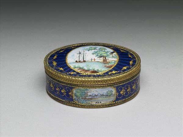 銅胎蓋盒,盒身邊緣有雕銅花邊,蓋與器壁皆開光彩繪西洋風景畫,其餘以藍色透明琺瑯並以金箔刻花琺瑯裝飾,底為藍色琺瑯。一組共九件(故琺6-14),合儲於雕福壽木盒中,內有糊橘色綾與錦座。罕見成組盒裝西洋琺瑯盒,或為廣州生產,應為進貢之用。