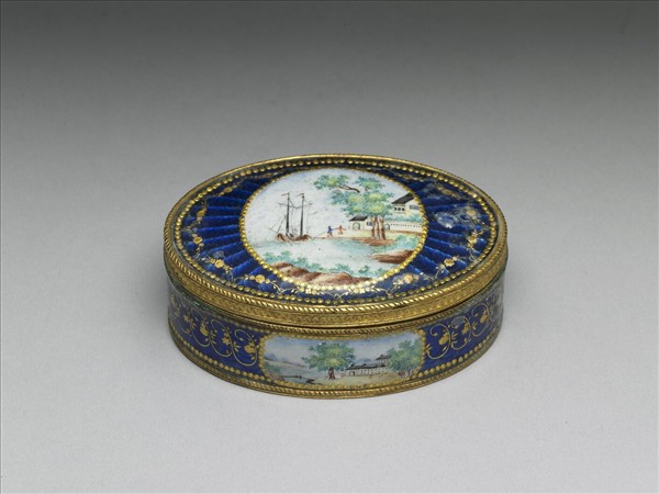 銅胎蓋盒,盒身邊緣有雕銅花邊,蓋與器壁皆開光彩繪西洋風景畫,其餘以藍色透明琺瑯並以金箔刻花琺瑯裝飾,底為藍色琺瑯。一組共九件(故琺6-14),合儲於雕福壽木盒中,內有糊橘色綾與錦座。罕見成組盒裝西洋琺瑯盒,或為廣州生產,應為進貢之用。