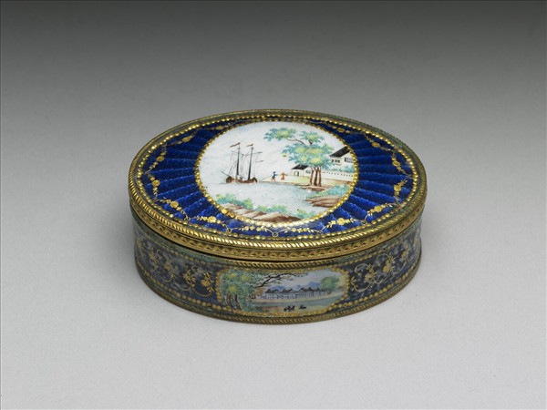 銅胎蓋盒,盒身邊緣有雕銅花邊,蓋與器壁皆開光彩繪西洋風景畫,其餘以藍色透明琺瑯並以金箔刻花琺瑯裝飾,底為藍色琺瑯。一組共九件(故琺6-14),合儲於雕福壽木盒中,內有糊橘色綾與錦座。罕見成組盒裝西洋琺瑯盒,或為廣州生產,應為進貢之用。