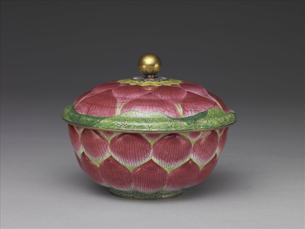 蓋碗,碗腹鏨成淺浮雕式三重瓣的蓮花。帶雙層圓冠式蓋,鍍金球鈕,銅胎,內外均施琺瑯彩釉,器內施淺藍釉,蓋面自中央向外繪蓮心、三層蓮辦及蓮葉。碗口飾一周蓮子紋,腹就浮雕的三重蓮瓣繪飾花脈,圈足繪成蓮柄。使全器宛如盛開的蓮花。底白地書紅色「康熙御製」雙方框兩行楷書款。