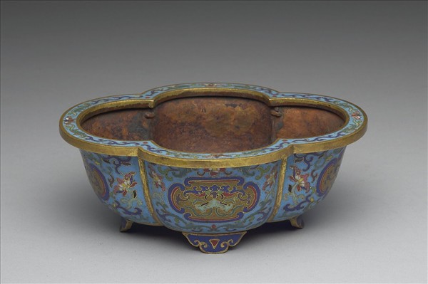 銅胎,掐絲琺瑯。海棠式四瓣水仙盆,侈口,折沿,深腹,平底,下接雲頭紋形足四。器外壁與折沿以藍色釉為地,每面雲形開光飾代表福慶吉祥意味的啣磬蝙蝠,其外作纏枝番蓮紋。器裡與底露銅胎。