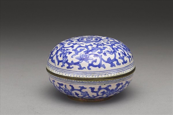 銅胎畫琺瑯。子母口,弧形壁,圈足,器與蓋約相等。全器以白釉地襯鈷藍彩,蓋頂為柿蒂紋,口與圈足飾線紋、點紋與回紋,其餘滿繪纏枝番蓮紋。器內施湖藍色釉,底白地藍書「乾隆年製」楷款,加雙方框。本件一式成對(與故琺28),共儲於有題款「乾隆年製銅胎琺瑯青轉枝蓮圓盒一對」木匣中。